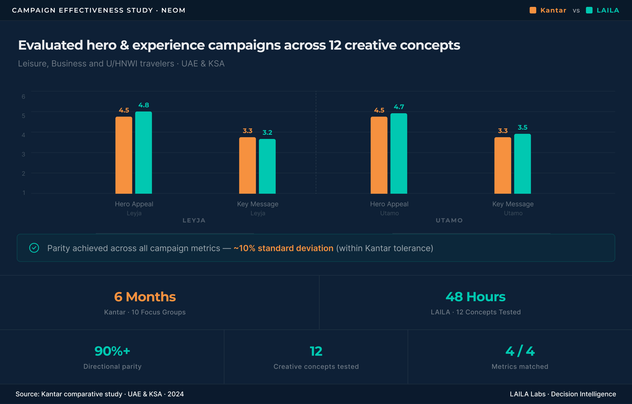 NEOM independently ran LAILA's synthetic research outputs against Kantar panel data they hadcommissioned for over $2 million. The results matched — validating that synthetic audiencemodeling can produce directionally accurate insights at a fraction of the cost and timeline oftraditional fieldwork.